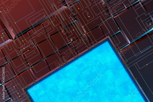 © Vink Fan, Obraz premium Circuit with glowing lines with dark background, 3d rendering.
