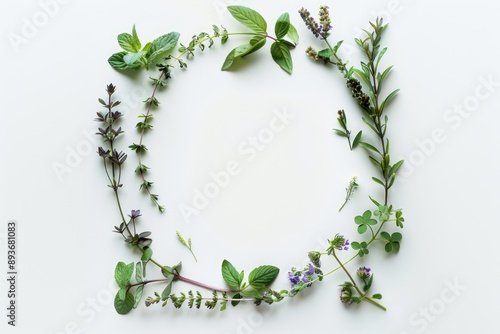 © Larisa, Naklejka premium Circular arrangement of various green herbs on white background