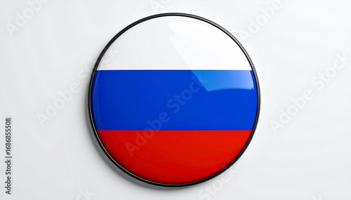 © Zaini, Fototapeta premium Circular badge featuring the Russian flag with horizontal white, blue, and red stripes, framed by a metallic rim