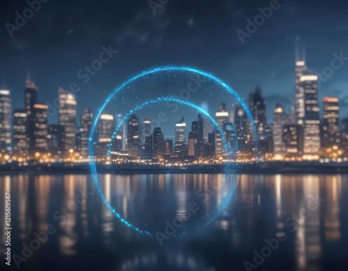 Naklejka premium Circular bokeh effect on blue background with city lights , glow, abstract, bokeh