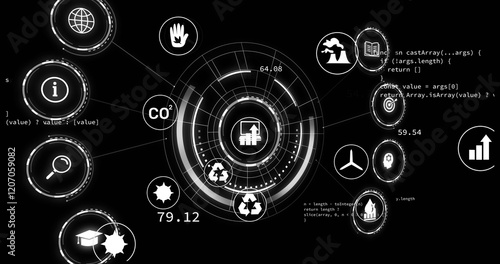 © vectorfusionart, Obraz premium Circular data visualization with environmental icons and coding image over black background