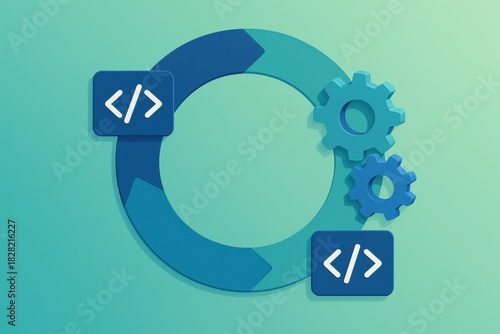 © Leo Rohmann, Obraz premium Circular digital workflow represented by interconnected coding symbols and gear mechanisms showcasing collaborative technology innovation and programming efficiency