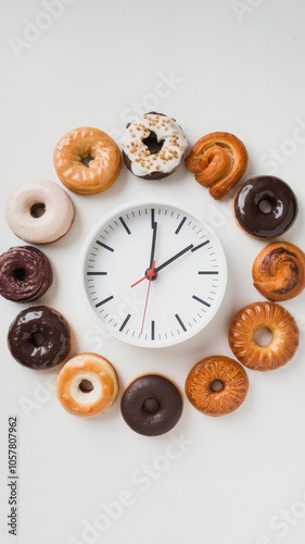 Obraz premium Circular donut arrangement around clock face on neutral gradient backdrop