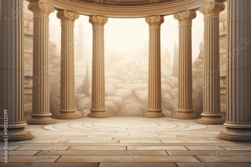 Naklejka premium Circular open air temple structure featuring classical ionic columns and stone flooring