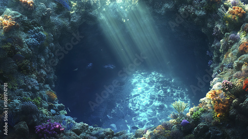 Naklejka premium circular opening in coral reef reveals deep blue underwater scene