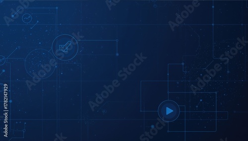 © The 2R Artificiality, Obraz premium Circular scanning devices analyzing information with a play icon on a deep blue backdrop. Digital network interface, data flow, connectivity, and worldwide communication, computer-generated graphic.