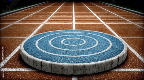 Obraz premium Circular Shot Put Platform on an Empty Athletic Track with Lane Markings and Dark Background
