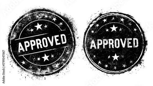 Fototapeta premium Circular stamp with star border, APPROVED in center, grunge texture, ink smudge details