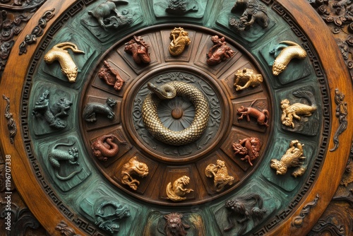 © jambulart, Obraz premium Circular wood carving; twelve animal figures; ornate frame.