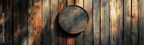 © gen_pick, Fototapeta premium Circular Wooden Signboard on Rustic Wall Urban Storefront Mockup
