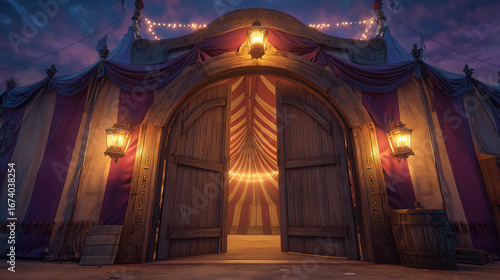 Obraz premium Circus tent entrance illuminated at dusk with open doors