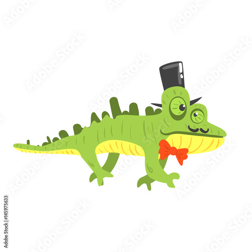 Fototapeta premium Cite cartoon chameleon wearing black top hat. Colorful character vector Illustration