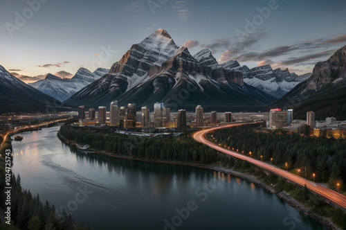 Naklejka premium Cities on the banks of rivers and beautiful mountains, with buildings and...