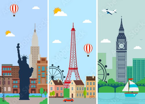 Fototapeta premium Cities skylines design with landmarks. London, Paris and New York cities...