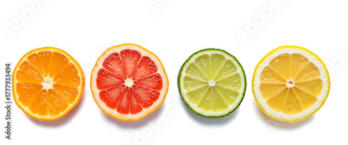 © Yasin, Fototapeta premium Citrus fruit slices arranged in a row on a white background