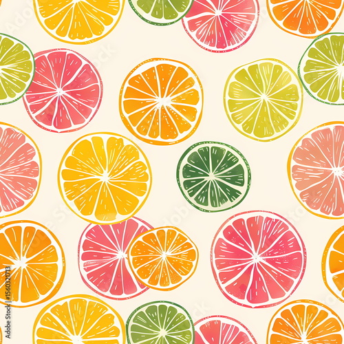 © Kristina, Fototapeta premium Citrus fruit slices pattern. Watercolor texture with orange, lemon, and grapefruit. Healthy food background for design.