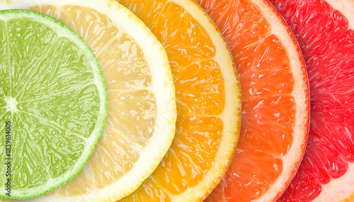 © New Africa, Naklejka premium Citrus fruits as background. Slices of orange, tangerine, lime, lemon and grapefruit, top view