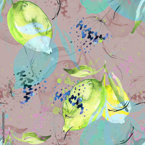 © helgafo, Fototapeta premium Citrus fruits. seamless watercolor pattern - hand drawing threads of lemon, Orange, lime with leaves. Trendy pattern. Painting. flower, lemon. Branch with citrus fruit. Citrus art background