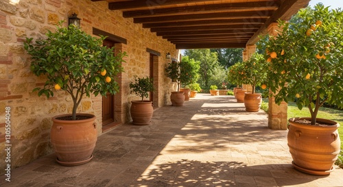 © ARDIA, Fototapeta premium Citrus Trees in Pots Lining Stone Building with Shaded Pathway
