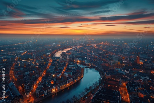 © Vlad, Fototapeta premium City Aerial Night. Aerial View of Leiden City at Night with Urban Skyline and Clouds