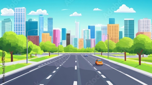 © Julia, Fototapeta premium City and roads background illustration concept. Public park and town with sky background.Beautiful nature scene with road to city.