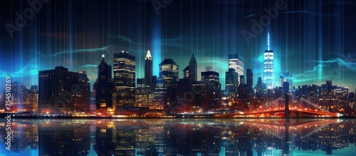 © naila mutmainah, Fototapeta premium city background at night, double exposure of growing arrows and metaverse abstract lines. Smart city concept, futuristic technology and business growth