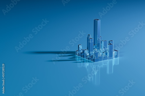 Obraz premium City block engineering model on reflective surface with copy space. 3D rendering.