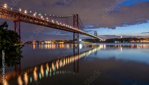 © Andri, Naklejka premium City bridge reflecting in calm water at twilight