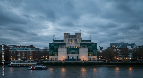 © arazka, Naklejka premium City Building on River at Dusk with Dramatic Cloudy Sky