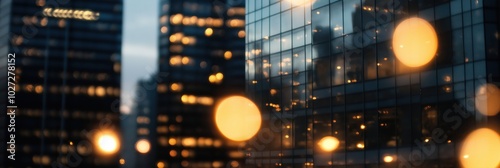 © gunzexx png and bg, Naklejka premium City buildings at dusk with blurred lights in the foreground, creating a vibrant urban scene that captures the lively energy and modern essence of city life.