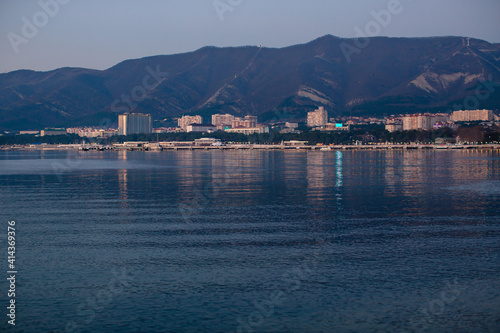 © Елена Дроздова, Naklejka premium City by the sea on the background of mountains