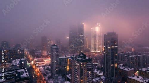 © Игорь Розводовский, Fototapeta premium City center with skyscrapers immersed in fog. High buildings. Early morning glow.
