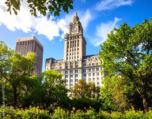 © desain, Naklejka premium City clock tower framed by trees and flowers