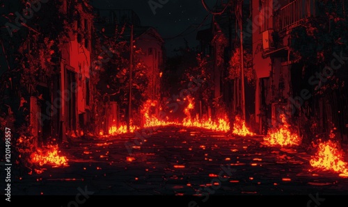 Obraz premium City consumed by darkness and flames, empty streets illuminated by fire
