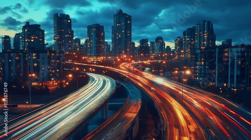 © atar, Fototapeta premium City Expressway at Night. Urban Traffic, Modern Architecture, and Cityscape.