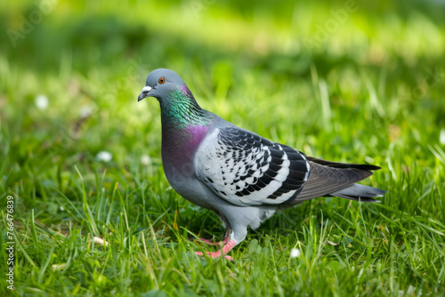 © hdesert, Fototapeta premium City gray pigeon in green grass in park