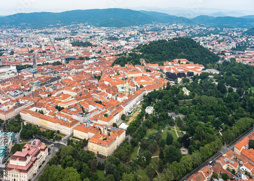Fototapeta premium City Graz center aerial view with Schloßberg, Uhrturm, central park