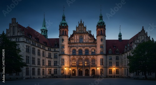 © arazka, Fototapeta premium City Hall Building Lit Up at Dusk with Architectural Details