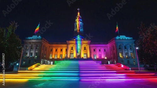 Naklejka premium City hall illuminated with rainbow colors at night, symbolizing inclusivity...