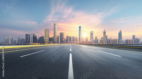 Naklejka premium City high way with motion blur effect against the background of city skyline