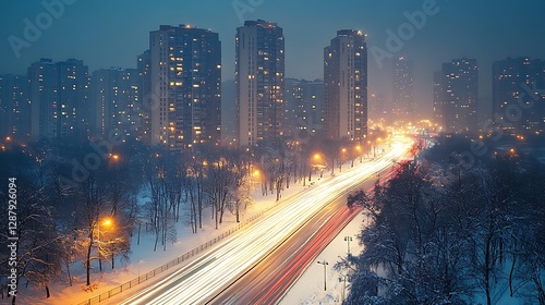 © Erika, Obraz premium City highway at night, snow, urban scene, light trails