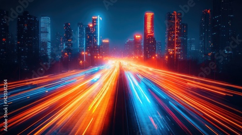 © rasya, Fototapeta premium City highway light trails with night skyline