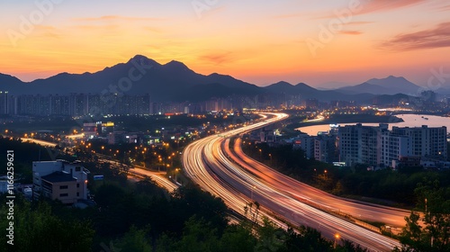 © irawan, Fototapeta premium City Highway Sunset Scenic Mountain View