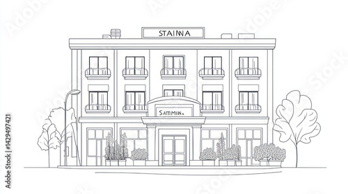 Fototapeta premium City hotel architectural line drawing, landscaping