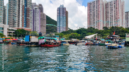 © Ryan, Fototapeta premium City lake with buildings and fishing boats in the background
