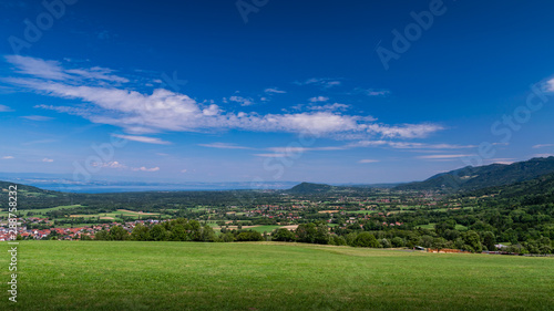 © mimpki, Fototapeta premium City landscape in the mountains, hills, fields, forests, green meadows, lakes in the distance and blue sky with clouds,focus area in the city.Haute-Savoie in France.