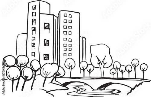 Obraz premium City landscape. Line urban backdrop. Different buildings on street, doodle...