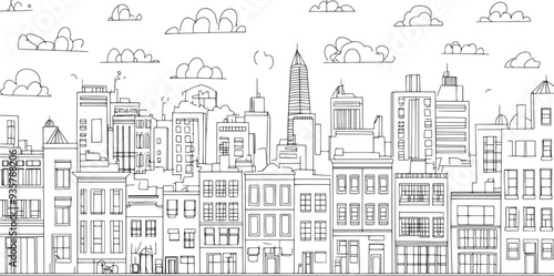 © Михаил Н, Naklejka premium City landscape. Line urban backdrop. Skyline with clouds, different buildings on street, doodle street draw, outline cityscape hand sketch, flat houses. Hand drawn vector illustration