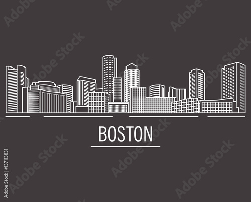 © dukesn, Naklejka premium City landscape of Boston in linear flat style on a black background