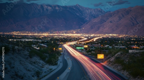 © BerkahStock, Fototapeta premium City lights and car trails in a valley with mountains at dusk.